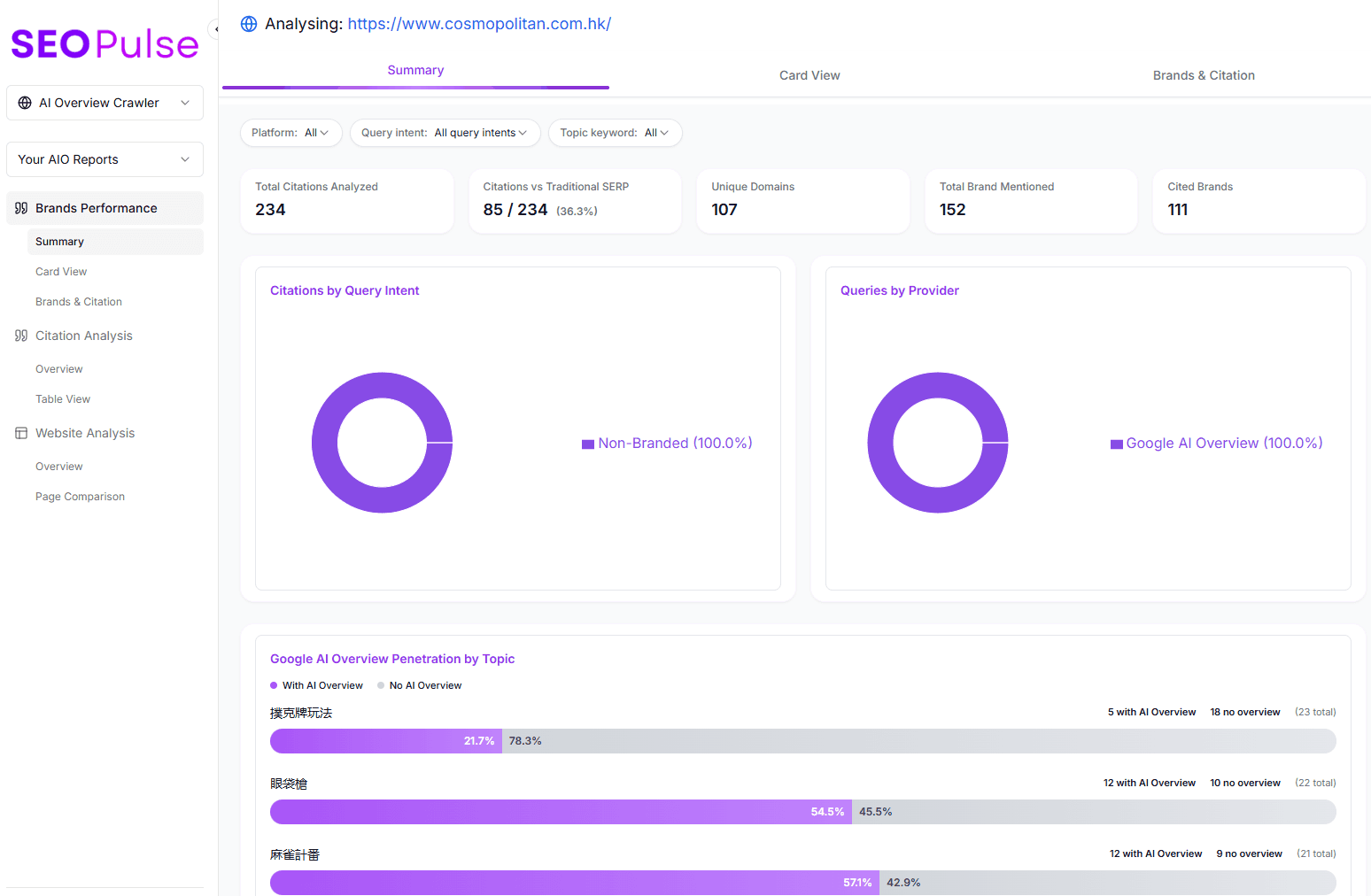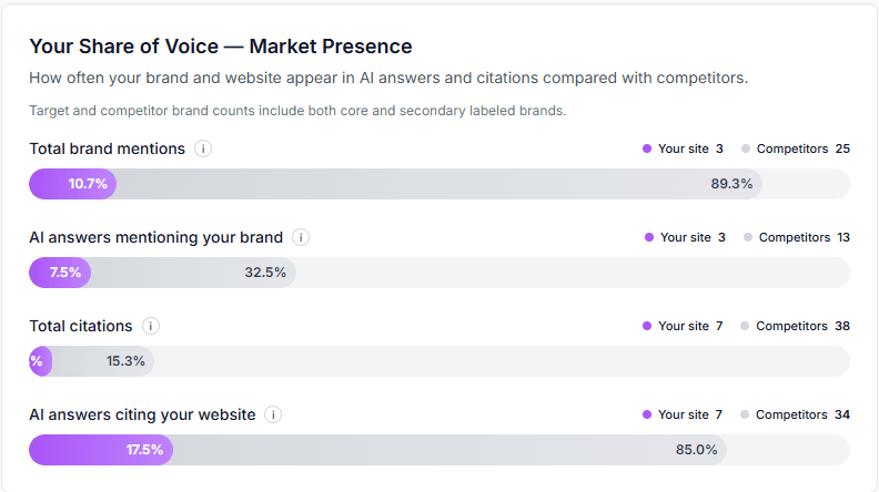 Most brands suffer from an AI Visibility Gap, where competitors or outdated third-party threads dominate the narrative. SEOPulse monitors how often your website is cited compared to the market. Gain real-time insights into your market presence across AI interfaces like ChatGPT and Perplexity. Identify exactly where you are losing citations and reclaim your brand’s "Recommendation Layer".