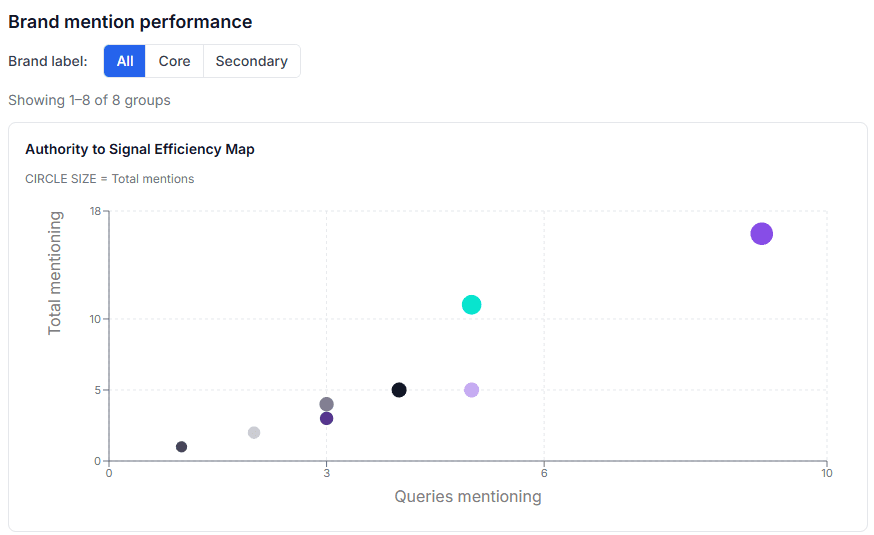 Entity Connectivity & EEAT Mapping AI engines prioritize "Entities" they recognize as authoritative. We quantify your Authority & Expertise by tracking how efficiently your signals turn into mentions.